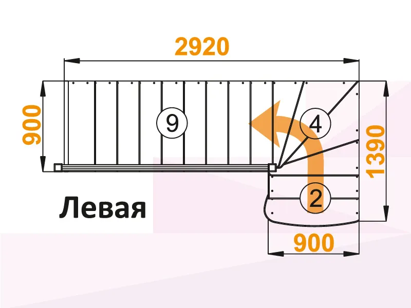 Поворот лестницы на 90 градусов выполнен с помощью 4-х забежных ступеней. Первая ступень лестницы - пригласительная (скруглены внешние углы)