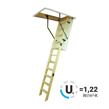 Лестница складная трёхсекционная, изготовлена из сосны. Термоизоляционная крышка типа "сэндвич" утеплена пенопластом, облицована с двух сторон ДСП белого цвета. Короб люка с однослойным уплотнителем. Все металлические элементы лестницы покрыты порошковой краской, ступени лестницы имеют антискользящие насечки и закреплены в столярное соединение «ласточкин хвост», что позволяет выдерживать нагрузку до 150 кг. Деревянный стержень для открывания лестницы в комплекте.