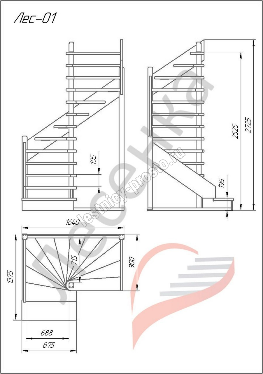 Деревянная межэтажная лестница ЛЕС-01 2525-2720 проем 1640-900, Бук