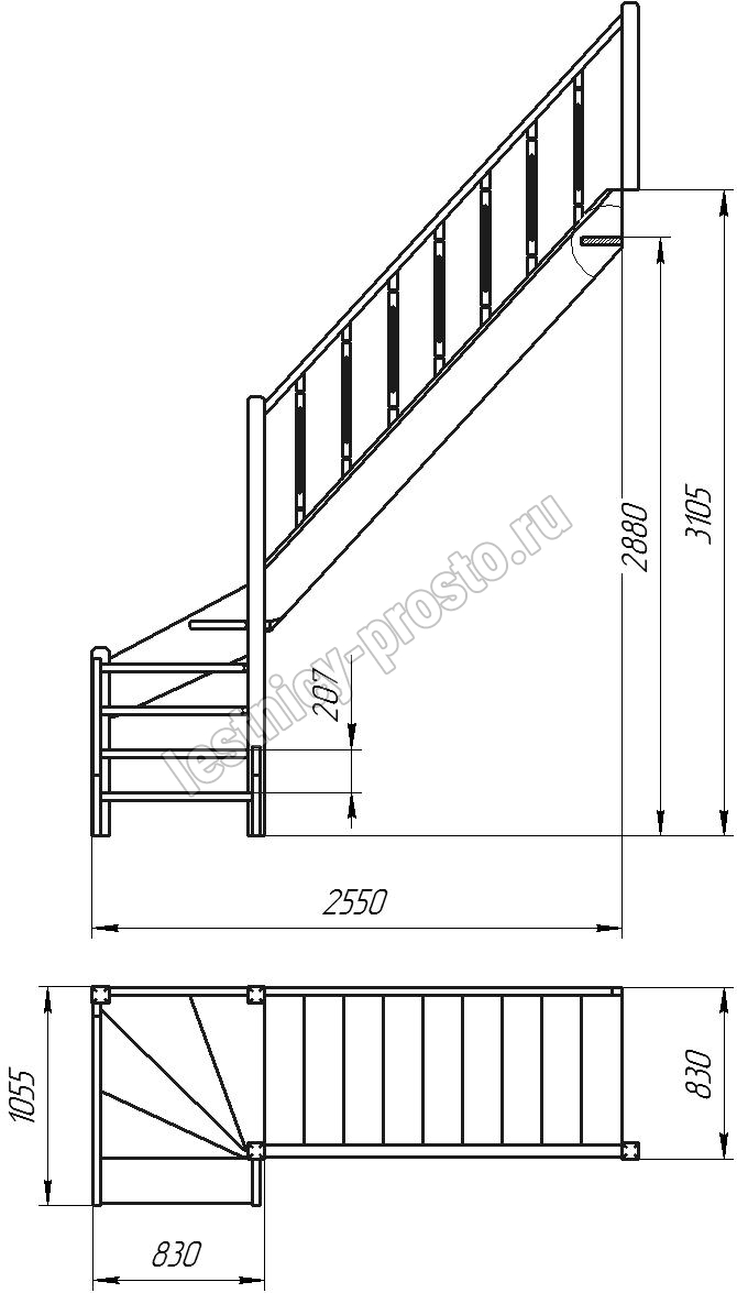 Деревянная межэтажная лестница ЛЕС-07 2880-3085 проем 2550-830, Лиственница