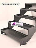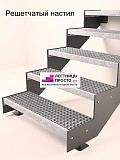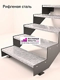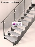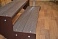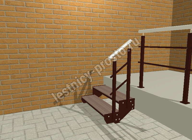 Ступени лестницы состоят из металлической рамки, обеспечивающей необходимую прочность, и покрытия из террасной доски ДПК (древесно-полимерный композит). Ступени не боятся воды и мороза, не теряют со временем свой внешний вид и не требуют ухода.