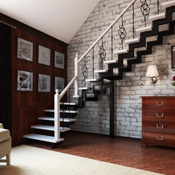 У данного варианта лестницы поворот реализован через забежные ступени. Под заказ возможно изготовление каркаса под поворотную площадку.