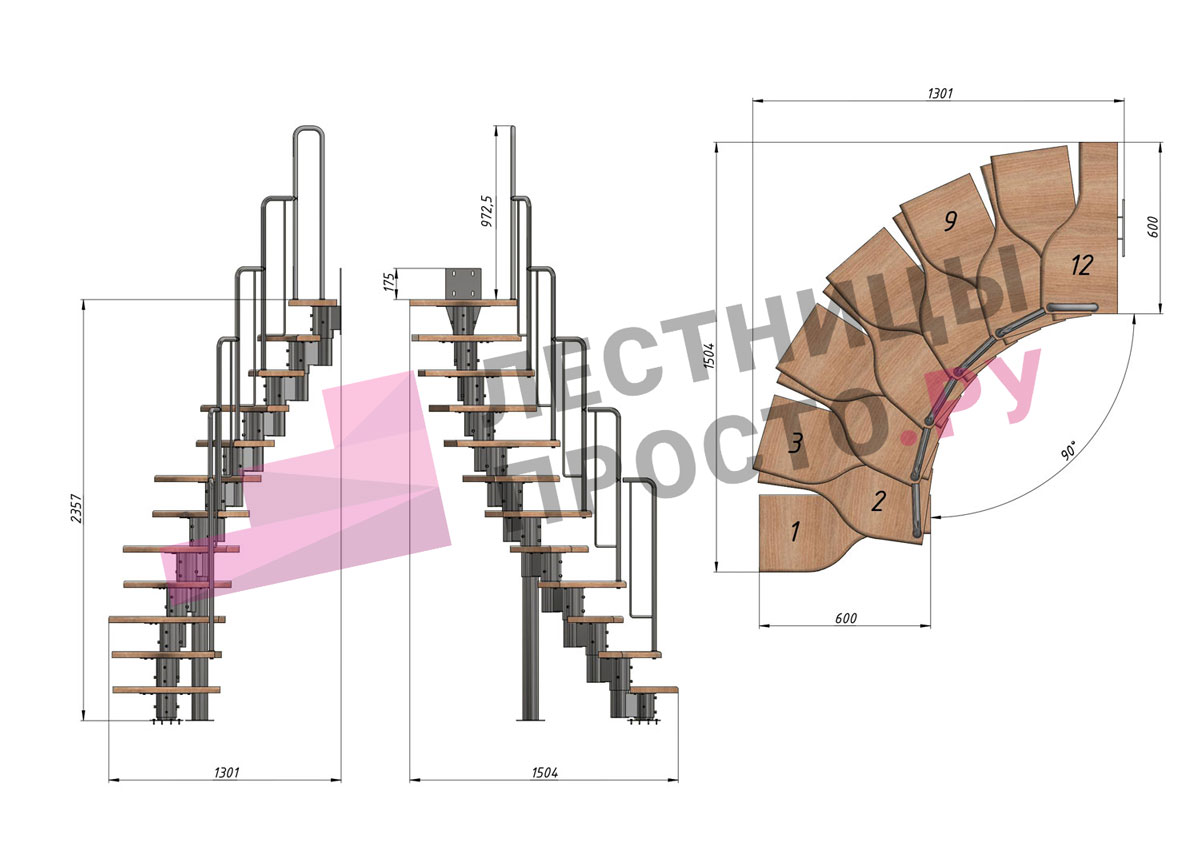 | Лестница Prosto Urban White гусиный шаг 600 мм, h234-336 см (13 ступеней), бук |