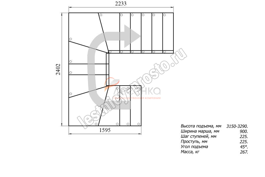 Модульная лестница Спринт 225 3150-3290, Серый, Сосна, Крашеная