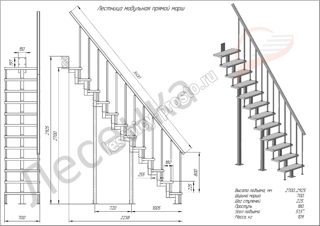 Модульная малогабаритная лестница Линия 2700-2925, Черный, Лиственница, Нержавеющая сталь