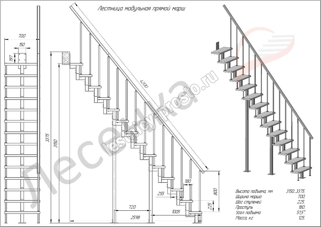 Модульная малогабаритная лестница Линия 3150-3375, Черный, Сосна, Нержавеющая сталь