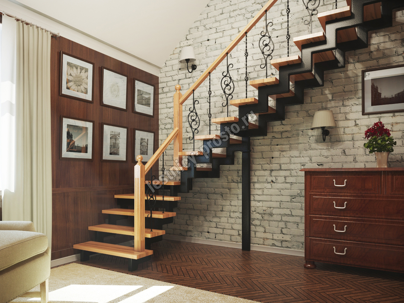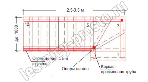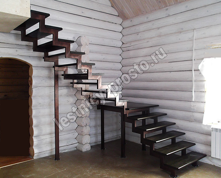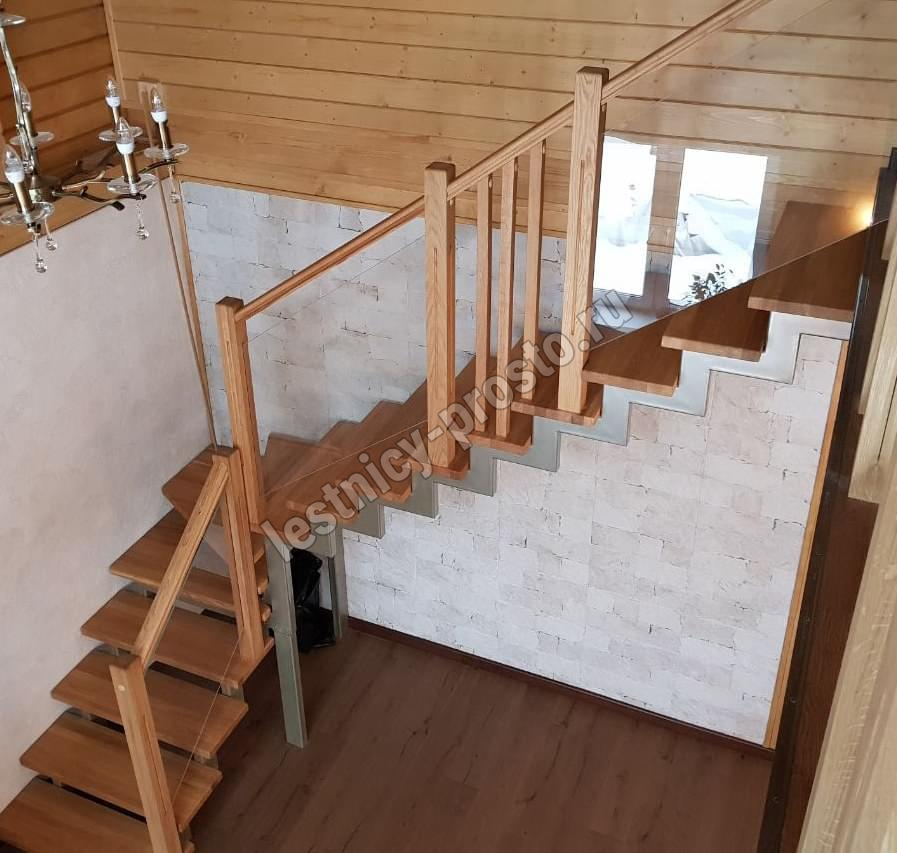 У данного варианта лестницы поворот реализован через забежные ступени. Под заказ возможно изготовление каркаса под поворотную площадку.