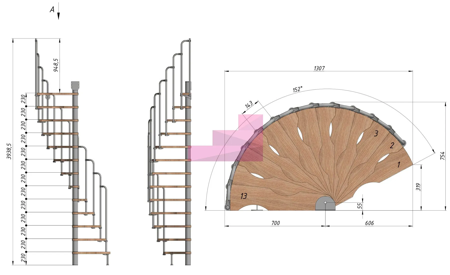 Высота лестницы 2990 - 3220 (13 ступеней) мм