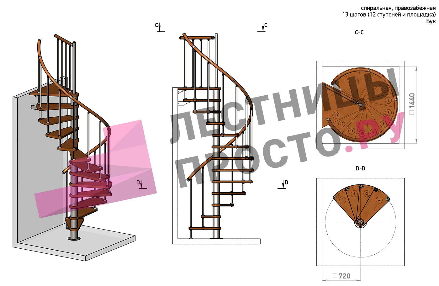 | Винтовая лестница Prosto Spiral White D140см, h282.2-326,3 см, бук |