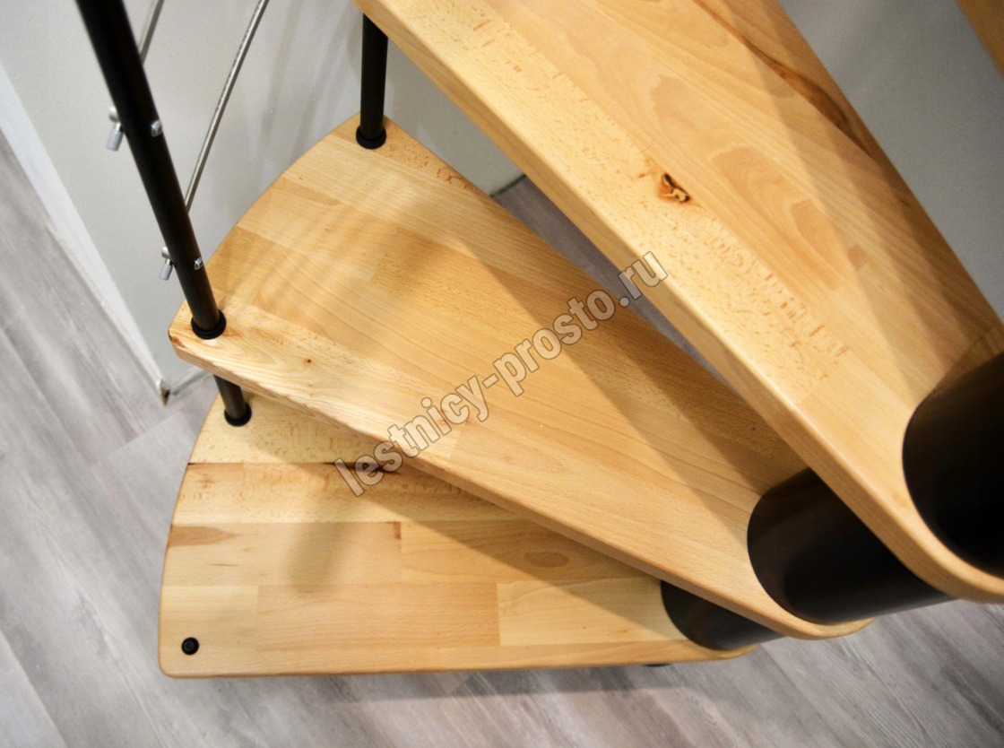 Cтупени и поручень изготовлены из массива бука и покрыты специальным лаком от компании Минка, который предотвращает царапины, сколы или стирание поверхности при интенсивном использовании лестницы.
